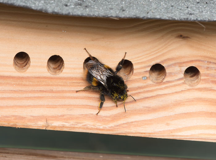 | Buff-tailed Bumblebee, Cley, 1st March 2026. This queen has obviously only just woken up and doesn't yet realise she's too big for this particular bee house! |