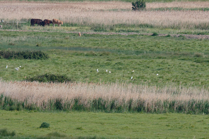 | Cattle Egrets, Blakeney Fresh Marsh, 1st June 2019. The same 11 adults as at Stiffkey yesterday (below), but even more distant. |