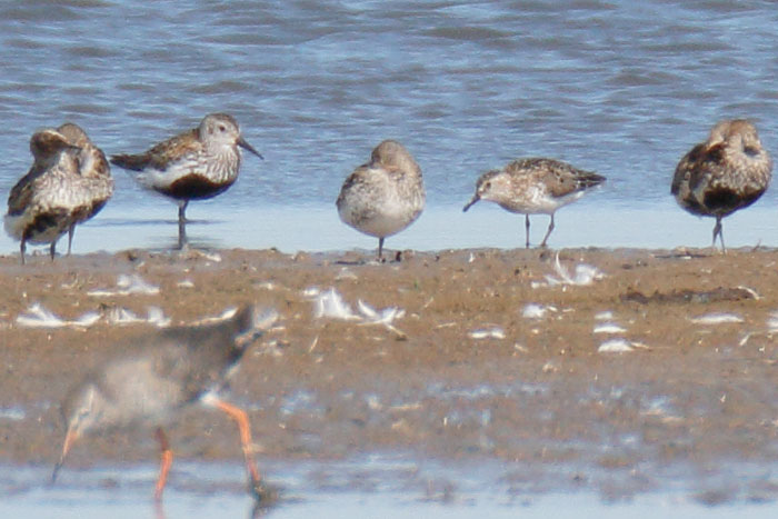 | Dunlins, Tundra Ringed Plover, Sanderling & Curlew Sandpiper, Cley, 2nd June 2019. |